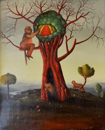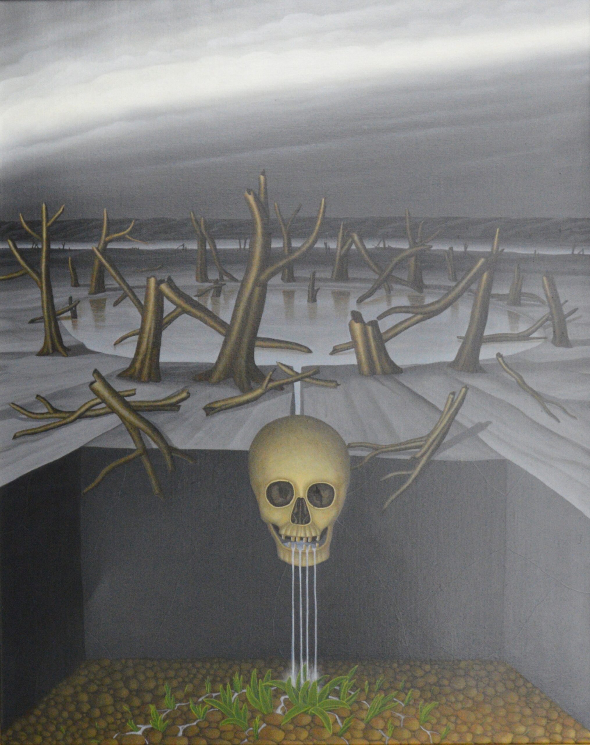 In the center of the picture is a tree on an island from which spring water pours into the landscape. There are more trees in the expansive landscape. The whole picture is shown in a day and night representation and stands for time and for life. The canvas, which has been torn open several times, ultimately threatens to destroy the picture. The painting has a custom-made model frame and was titled, dated and signed on the back.