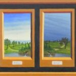 The oil painting consists of four miniatures – the four seasons (spring, summer, autumn and winter). The four miniatures depict landscapes, each with a river. This rivers flow from the horizon of the landscape into the foreground of the painting. The landscape is characterised by rocks and rivers, as well as trees on the riverbank. The trees change colour with the seasons, until they are bare. The painting has a custom-made model frame and is titled, dated and signed on the back.