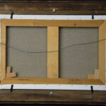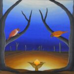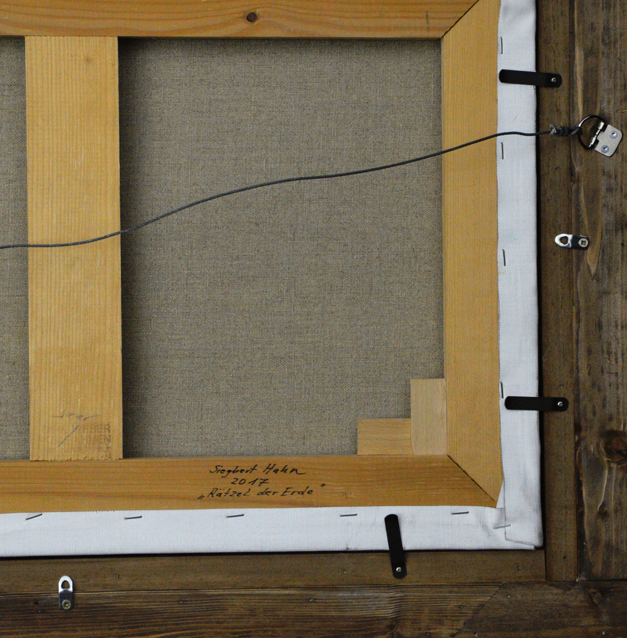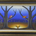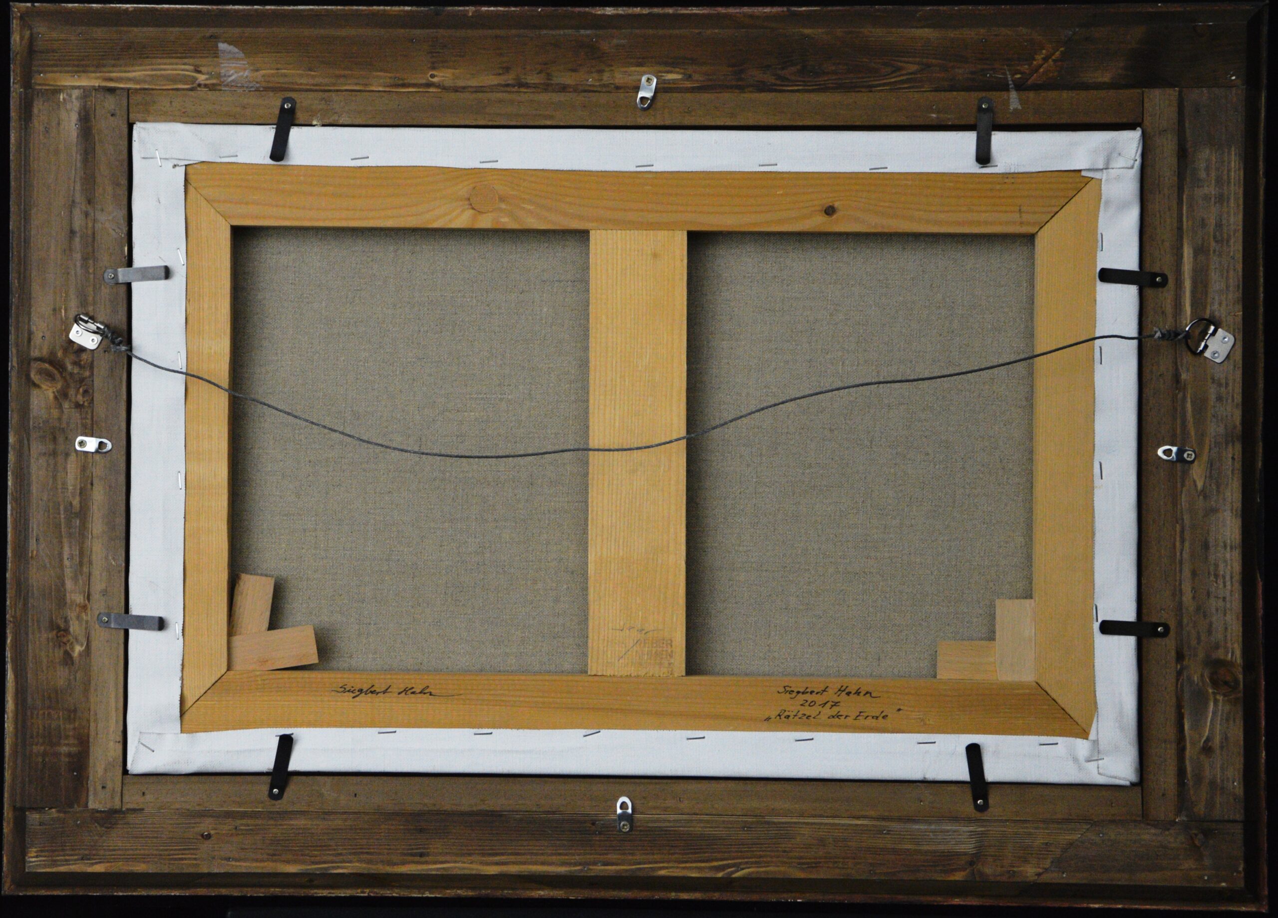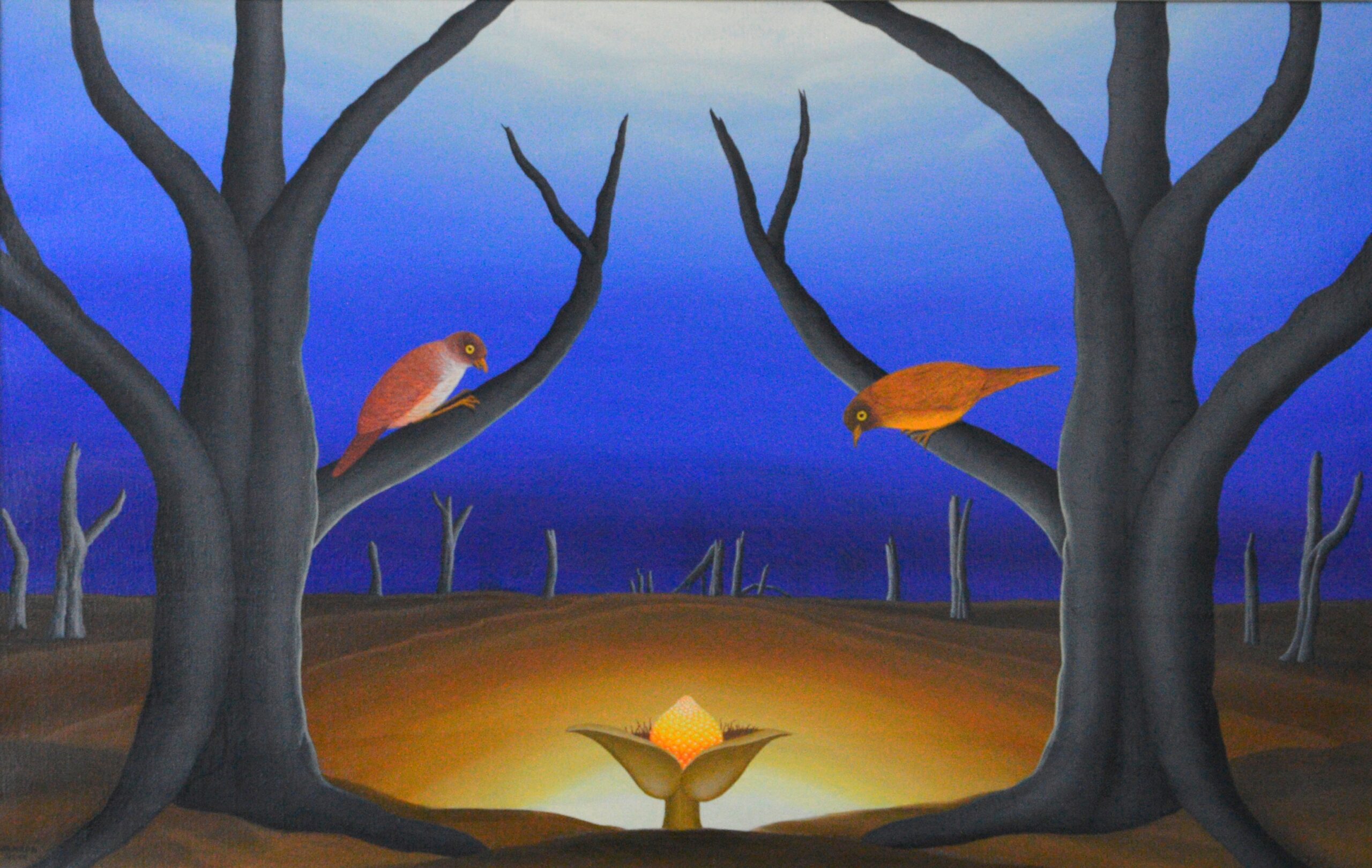 Au centre de l’image se trouve une plante mystérieuse avec une fleur qui pousse dans un trou rougeoyant dans le sol. L’ambiance énigmatique de l’image est soulignée par les arbres morts autour du trou et les arbres brisés en arrière-plan. La lumière vive à l’horizon crée une ambiance pleine d’espoir tout au long de l’image. Deux oiseaux sur les arbres de la première rangée regardent avec étonnement la fleur. La peinture a un cadre de modèle sur mesure avec un passe-partout. Le tableau est signé et daté au recto et au verso du tableau.